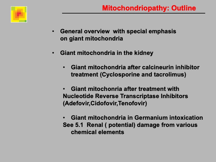 Definition: Mitochondrial abnormailies due to drugs are found in cells of the proximal tubules. The mitochondria differ in number, size (giant mitochondria / megamitochondria), shape, and structure of cristae from normal tissue. Giant mitochondria are visible by light microscopy as inclusion bodies in individual tubular cells.