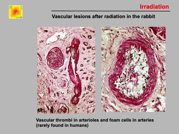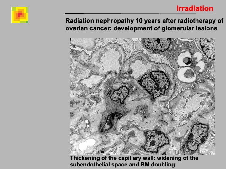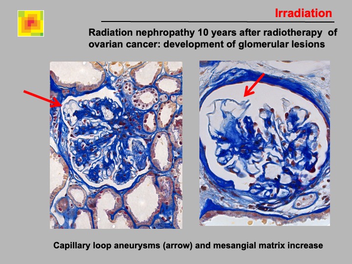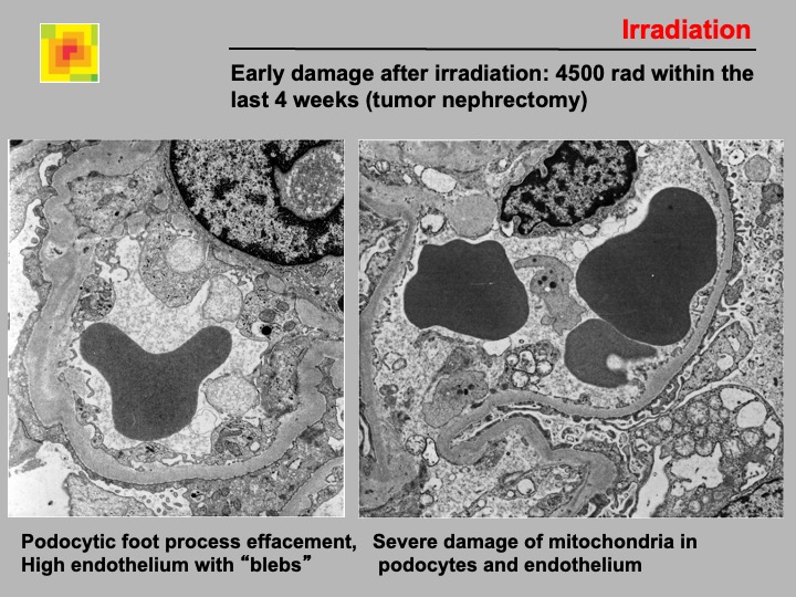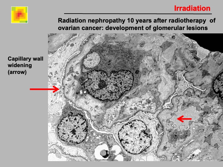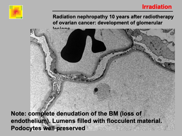 Arterioles and interlobular arteries are most severly affected by fibrin thrombi and/ or massive circular and often transmural protein deposits (arteriolar hyalinosis). The arteries may show a mucoid widening of the intimal layer and, rarely, foam cells. Endateritis is not a feature of radiation nephropathy, thrombi and arerial changes are.