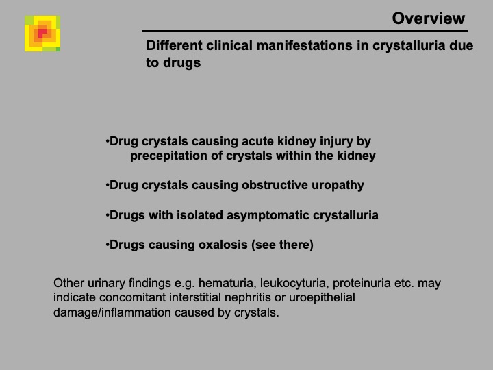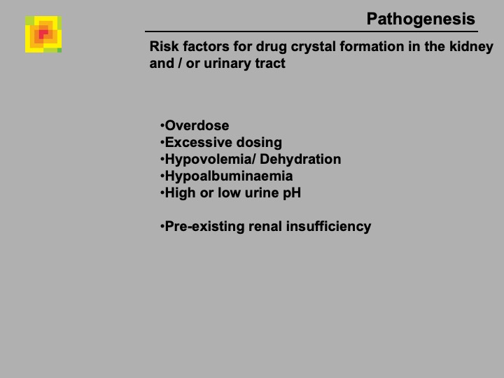 Definition: Drug crystals causing acute kidney injury by precepitation of crystals within the kidney